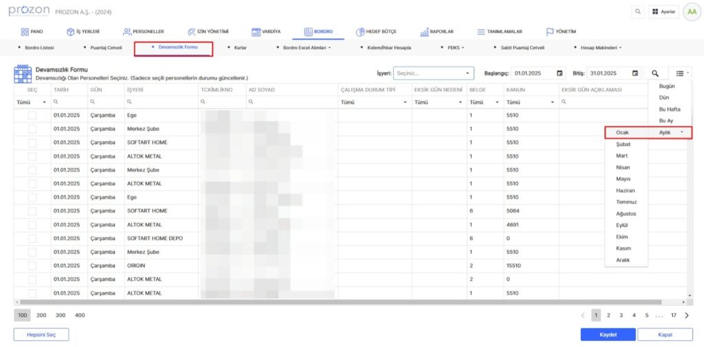 Devamsızlığı olan personellerin tarih aralığı girerek veya üç çizgiden dönem seçerek devamsızlık tarihi, eksik gün sayısı ve eksik gün nedenini iş yer kırılımlı olacak formatta raporlanabildiği alandır.