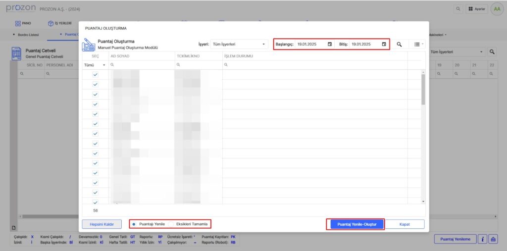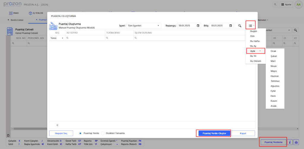 Açılan sayfada sağ üstteki üç çizgiden bu ay seçilir ve sonrasında o aya ait tüm personeller toplu olarak ekrana yansır, sonrasında “Puantaj Yenile – Oluştur” seçilerek tüm personellerin puantajı çalıştırılır.