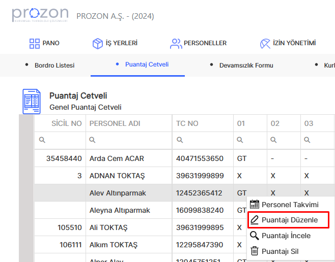 Bu alana sıralanan tüm çalışanların puantajlarından istenen bir personel özelinde manuel bir düzenleme yapılmak istenirse düzenlenecek kişinin satırı sağ tıklanarak düzenle seçeneği tıklanır.