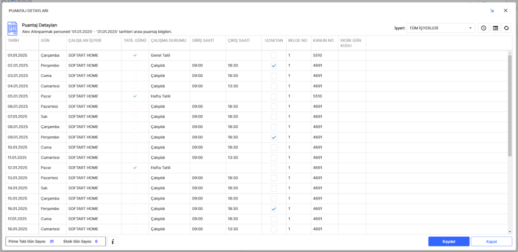 Sonrasında tüm personeller aşağıdaki ekranda puantajları çalışmış halde görüntülenir.