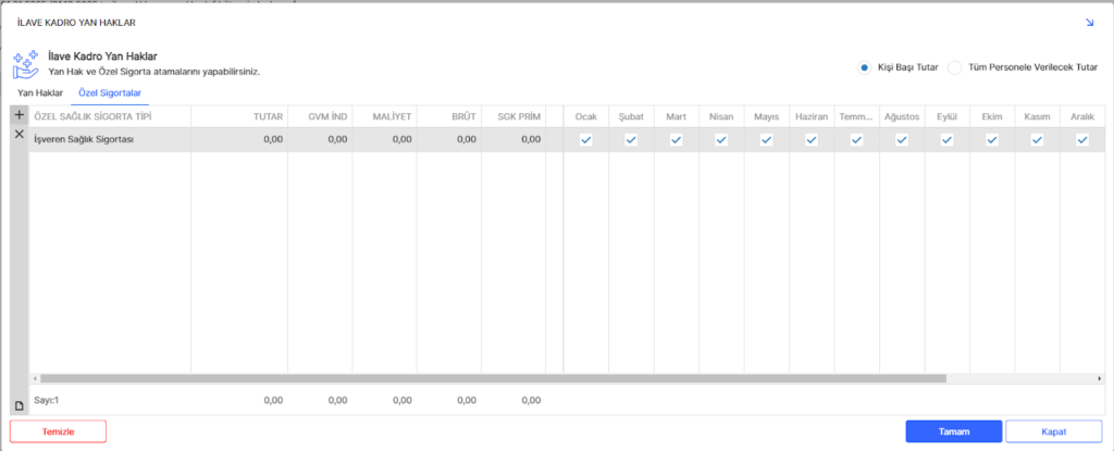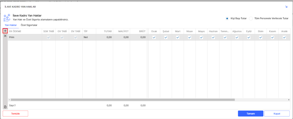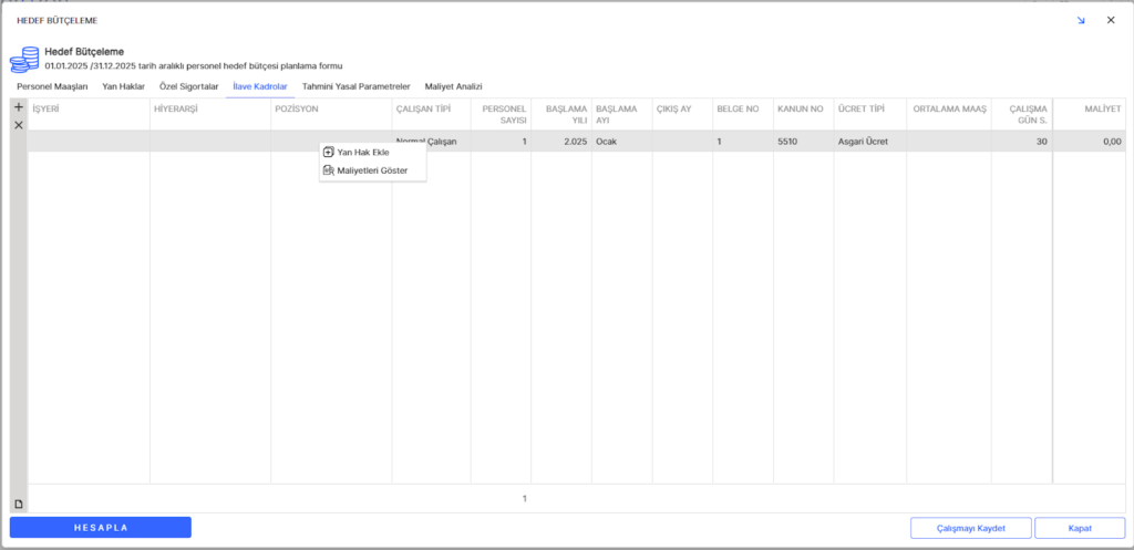 İlgili satıra sağ tıklayarak yeni işe alacağınız personelin yan haklarını belirleyip, maliyetini görüntüleyebilirsiniz.