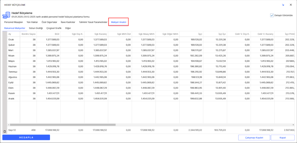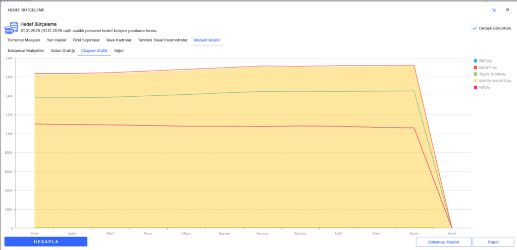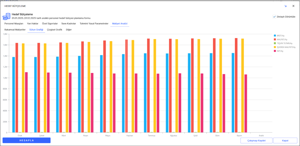 Maliyet Analizi sekmesinde oluşturduğunuz hedef bütçenizin tüm detaylarını rakamsal, çizgi grafik ve sütun grafik olmak üzere 3 farklı şekilde görüntüleyebilirsiniz.