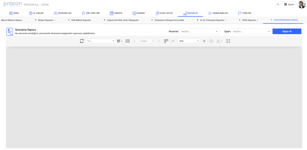 Bu ekran, bir çalışanın işten ayrılırken tüm alacaklarını almış olduğunu belirten bir belge olan ibranamenin oluşturulmasına yönelik bir raporlama aracıdır.