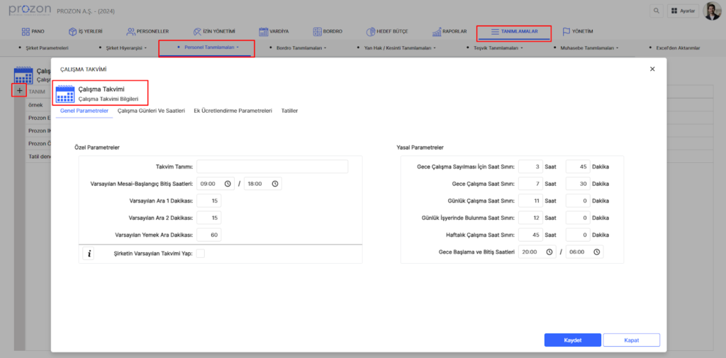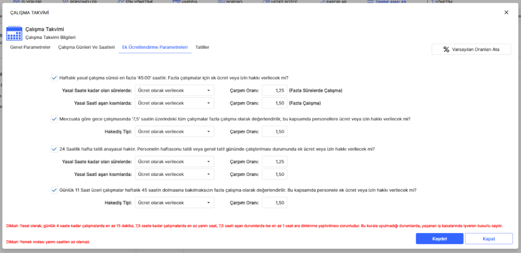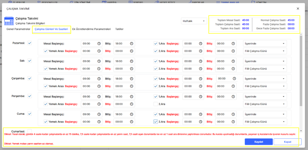 Bu alanda şirketin mesai saatleri, ara süreleri ve yemek molası zamanlamalarının tanımlamaları yapılır. Saatlerin yasa dışı tanımlanması yapılırsa aşağıda kırmızı ile mevzuat uyarısı vererek sizleri yönlendirecektir.