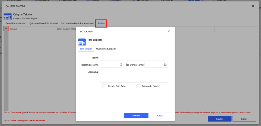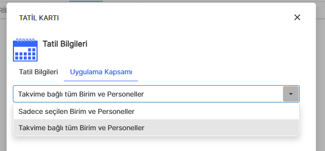 Yıl içindeki arife ve resmî tatil günlerinin başlama ve bitiş tarihlerinin tanımlandığı alandır. Firma özelinde belirlenen özel tatil günleri de bu alandan tanımlanarak yönetilebilir. (örn. fabrika tatili) Aynı zamanda “Uygulama Kapsamı” sekmesine gelerek ilgili tatilin hangi personellere atanacağını da özelleştirebilirsiniz.