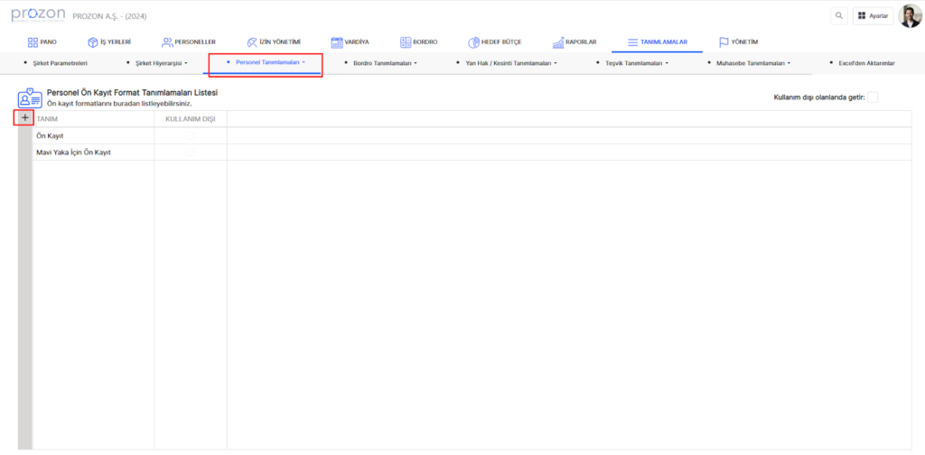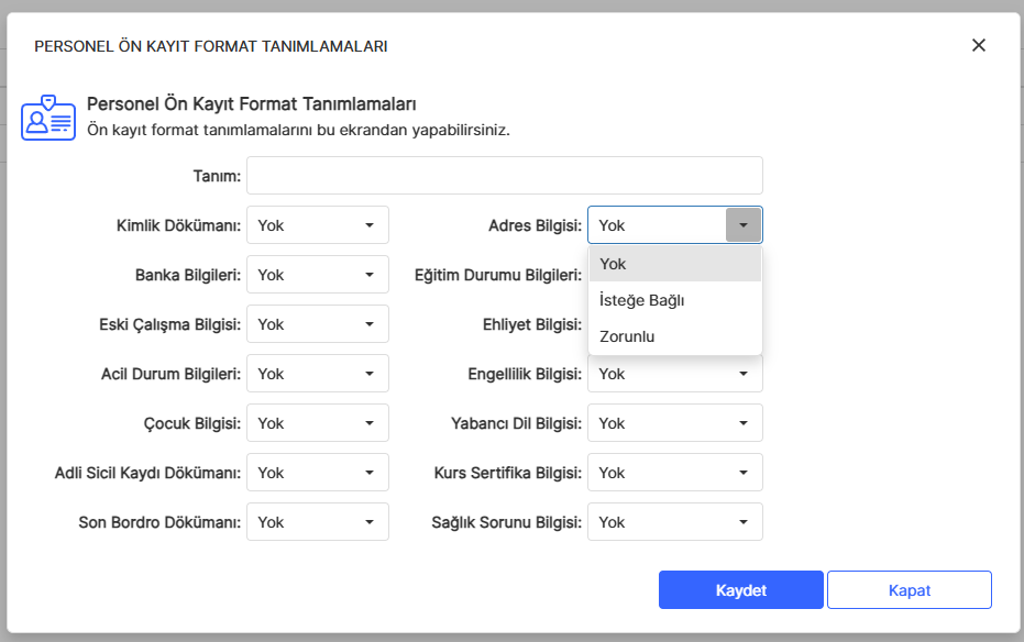 Bu ekranda yeni ön kayıt tanımlayabilir, düzenleme ve silme işlemlerini gerçekleştirebilirsiniz. “ + “ butonuna tıklayarak tanım kartını açıyoruz. Ardından Ön Kayıt’ta personelden hangi bilgileri almak istediğimizi seçiyoruz.