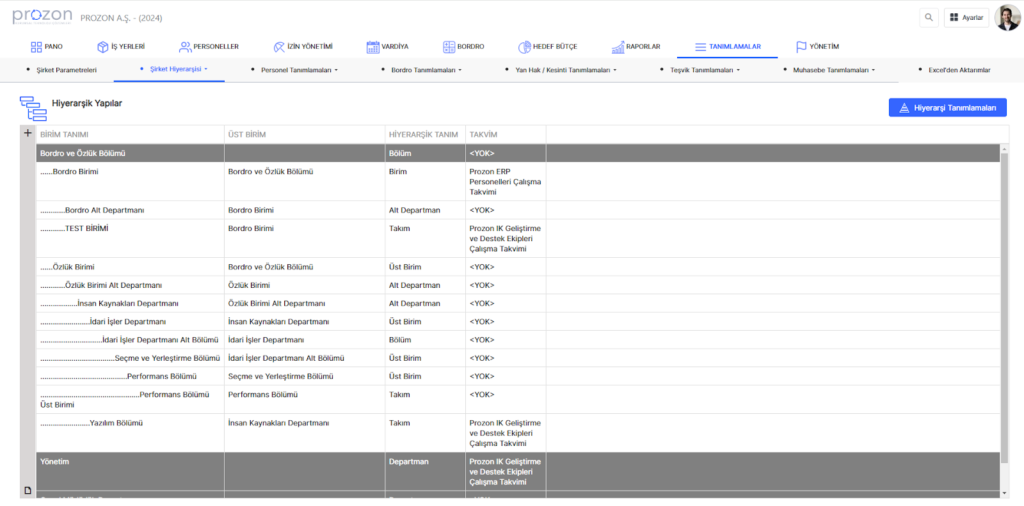 Şirketin Üst Birim, Birim ve Hiyerarşik konum tanımlamalarının yapıldığı alandır. 6. Raporlar üst başlığındaki alan üzerinden veri çekildiğinde, bu alanda tanımlanan Birim bilgileri de çekilebilmektedir.