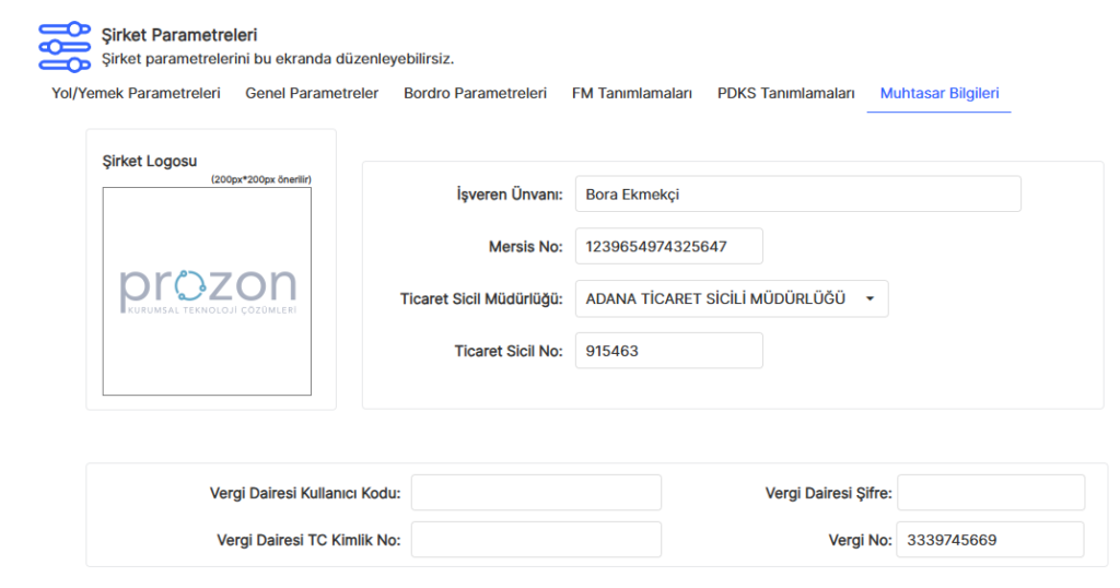 Şirketin muhtasar beyanname alanı bilgilerinin tanımlandığı alandır.