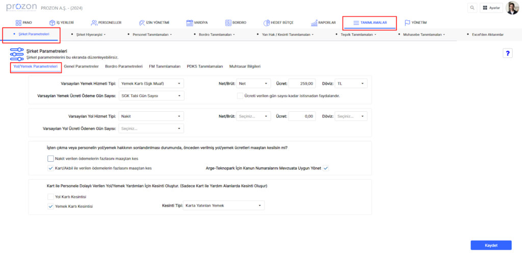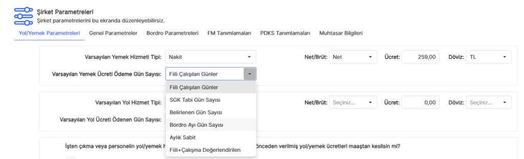 Varsayılan yemek hizmeti tipi yemek kartı seçildiği zaman hem tutar hem de fiili gün tanımlaması yapılır. Bu tanımlama ile iş yerinin altındaki şirketlerin hepsine;