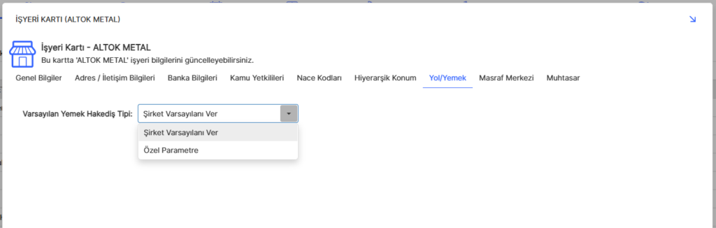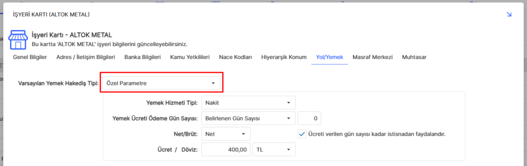 Ancak alt şirket özelinde bir şirket örneğin 400 TL net ödeme yapmak istiyorsa, ayrı yönetmek istediğimiz yerde ise iş yerlerine gelip orda varsayılan yemek kısmı özel parametre seçilerek içinde olduğumuz şirketi seçerek farklı tanımlama yapabiliriz.