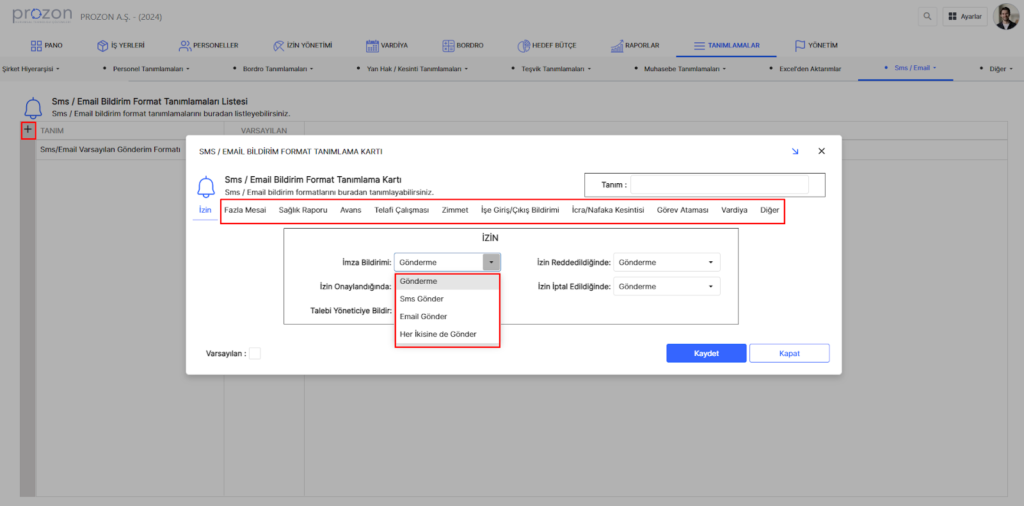 Bu ekranda Sms ve Email Bildirimlerinin format tanımlarını “ + “ butonuna tıklayarak açılan kartta gerçekleştirebilirsiniz. Sekmede görüldüğü üzere sistemdeki tüm aksiyonlar için Sms ve Email bildirimi gerçekleştirilebiliyor, hangi aksiyonların bildirimleri personele bildirilecekse bu ekrandan yönetimi sağlanmaktadır..