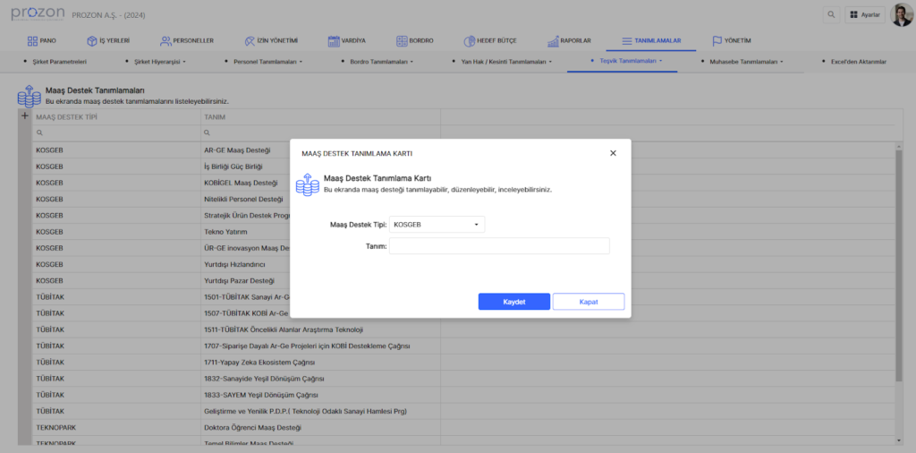 Maaş destek tanımlamalarının yapıldığı alandır.