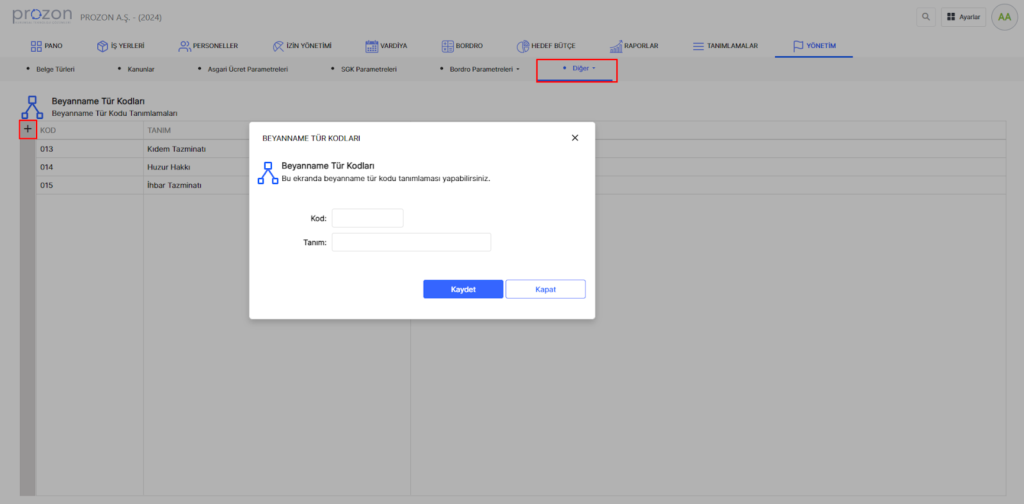 Beyanname ekranına akacak olan paketin oluşturulabilmesi için tanımlanması gereken ücret kodları. Eğer muhtasar beyanında yeni bir kod eklenecekse bu alandan önce kodun yaratılması ve ödeme kalemlerine bağlanması gerekmektedir. Bağlama ile ilgili ayrıca ilgili alanda bilgi verilecektir.