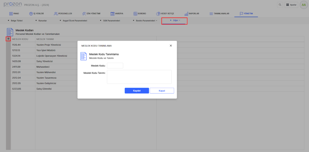 Meslek kodu tanımlamalarının yapıldığı alandır.