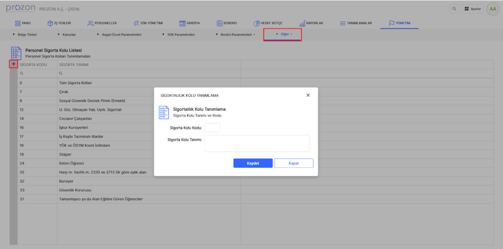 Personellerin sigorta kolu seçimlerinin tanımlandığı alandır. Yeni sigortalılık kodu yayınlanmadığı müddetçe bu alana müdahale edilmemelidir.