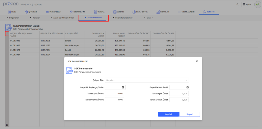 Bu kısım, yazılımcılar tarafından otomatik olarak güncellenmekte olup, dileyen müşterilerimize açılan alanlar sayesinde kendi güncellemelerini yapabilecekleri alandır. Güncellenen SGK tutarına istinaden, normal ve emekli çalışan gibi değişen parametre verileri ve dönem aralığı bu alandan revize edilebilir.