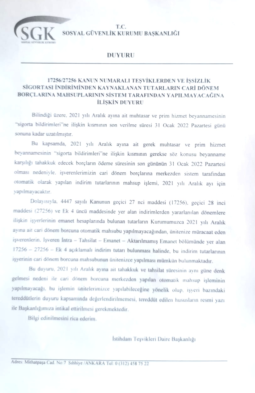 SGK 27 Ocak 2022 tarihli Duyurusu ile 2021 Aralık ayı 17256-27256 ve iş kazası prim desteği ile ilgili olarak otomatik olarak mahsup işleminin yapılacağını bildirmiş, ancak 28 Ocak 2022 tarihli Duyurusunda işverenlerin ilgili SGK Ünitelerine müracaat ederek Manuel olarak yapılacağını ilan etti.