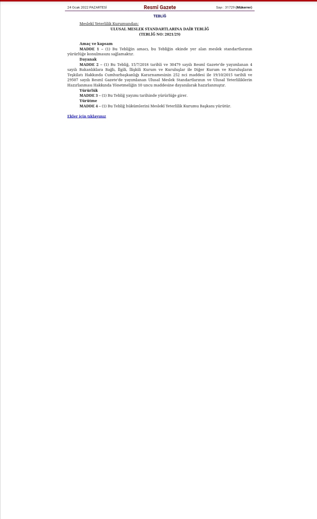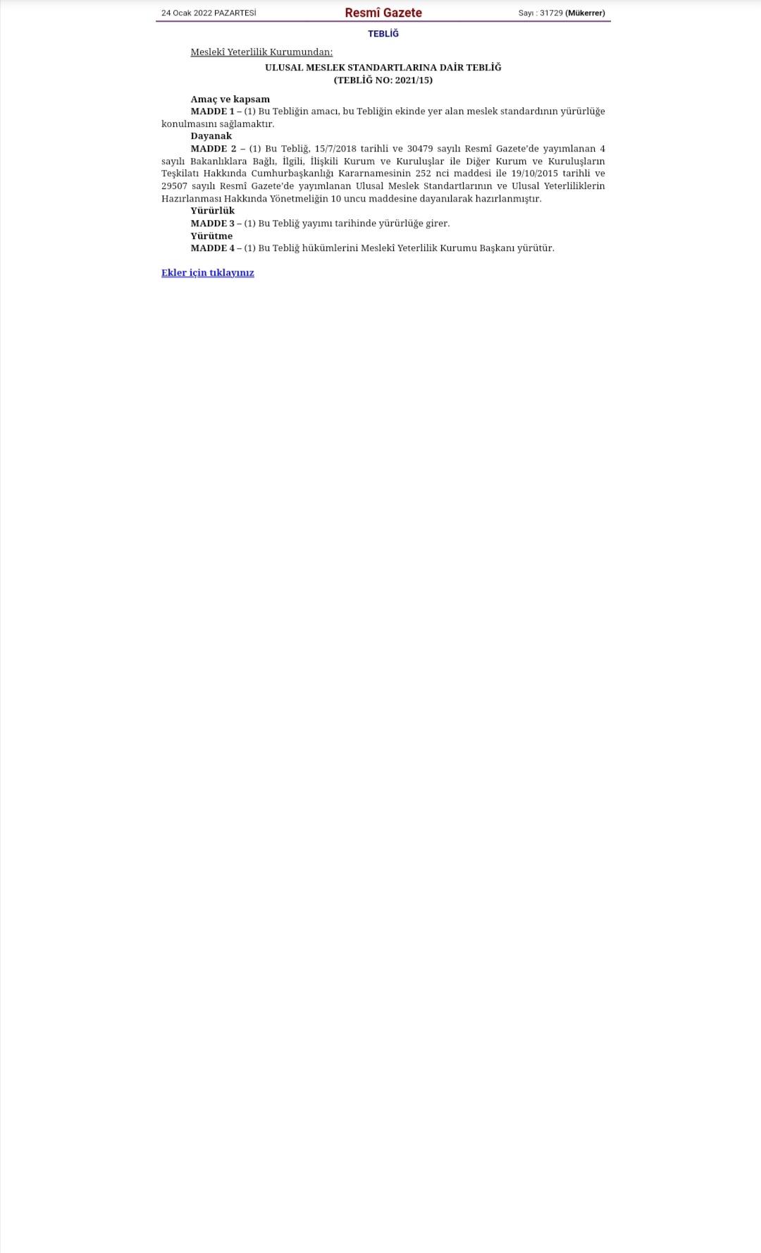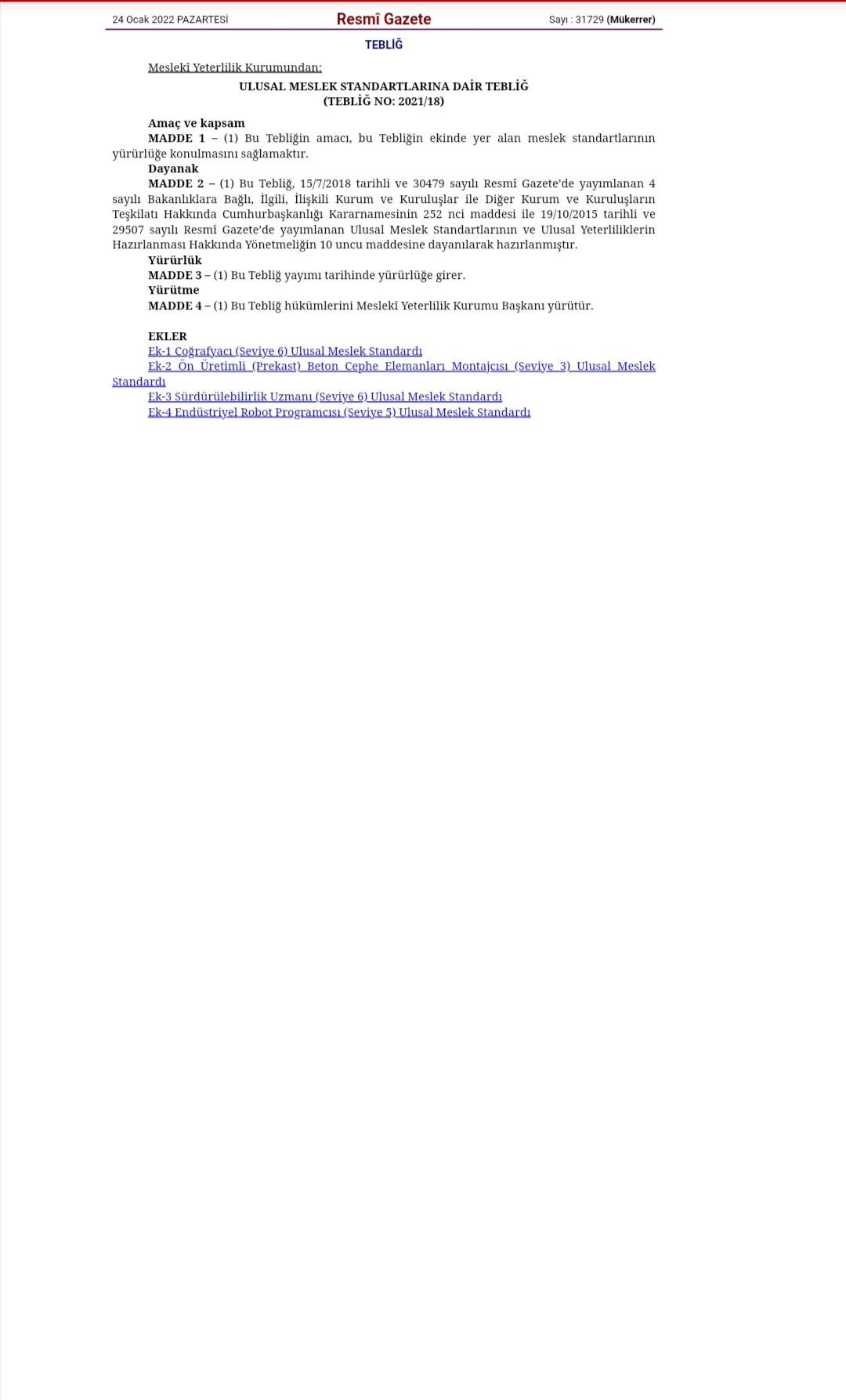 Resmi Gazete’nin 24 Ocak 2022 tarihli mükerrer sayısında 6 adet ulusal meslek standartı daha yayımlandı.