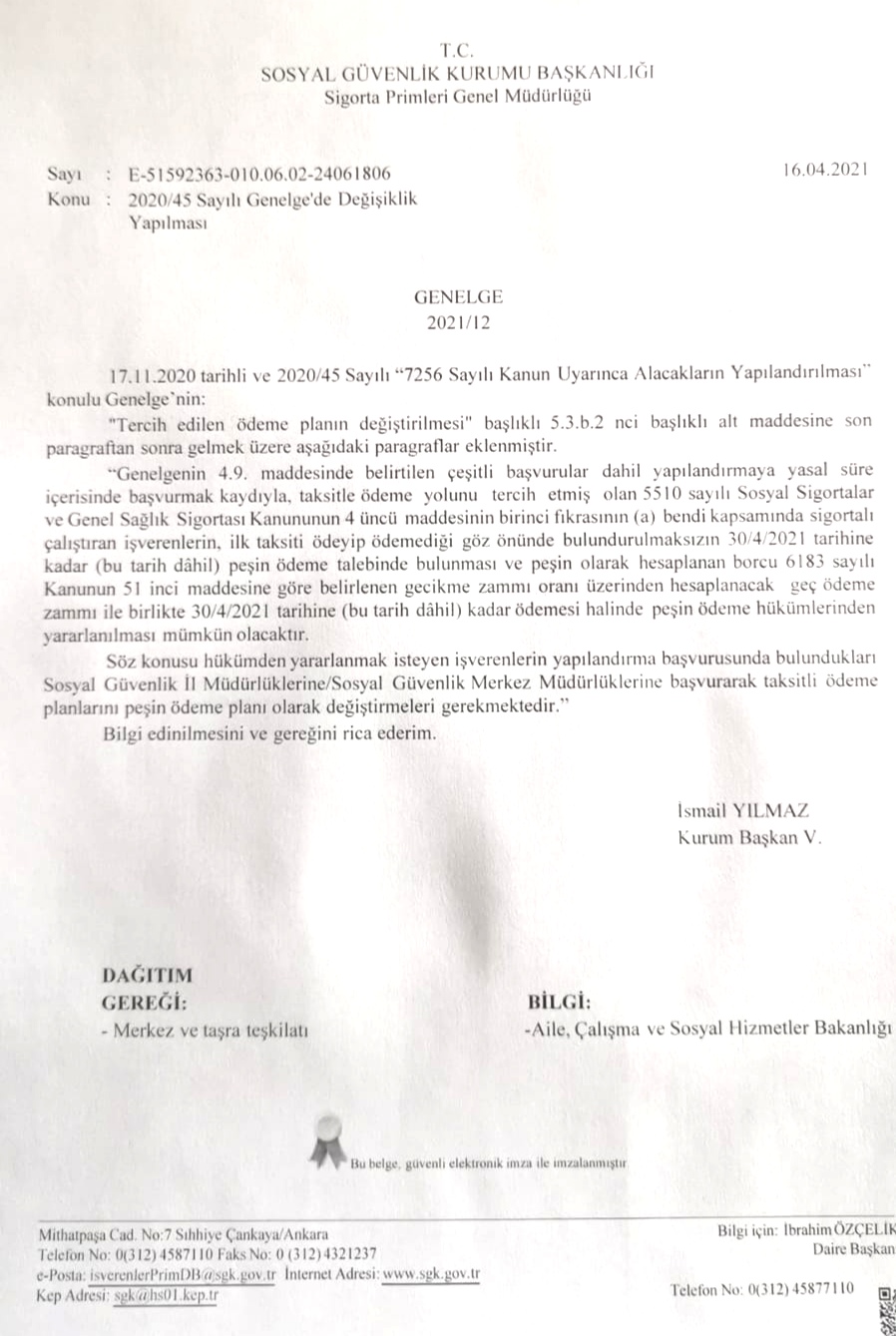 SGK Başkanlığı Sigorta Primleri Genel Müdürlüğü yayımladığı 16.04.2021 tarih ve 2021/12 sayılı Genelgede; 7256 sayılı Kanun gereği yapılandırıp ancak ilk taksidi ödemeyen işverenlerin 30 Nisan 2021 tarihine kadar peşin ödeme talebinde bulunmaları ve bu tarihe kadar ödemeleri halinde peşin ödeme hükümlerinden yararlandırılacaktır.