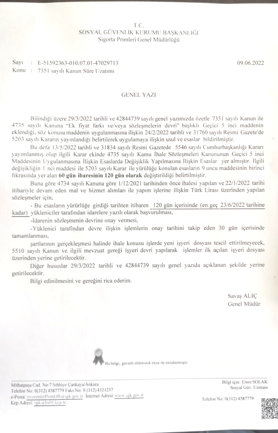 7351 sayılı Kanun ile yapılan düzenlemede ihaleli işler için SGK dosyalarının ne şekilde işlem göreceği konusunda SGK yayımladığı 29 Mart 2022 tarihli Genel Yazısı ile uygulamayı belirlemiş, uygulamanın 2020 – 20 sayılı Genelgenin 5.2.1.maddesine göre işlem yapılacağı belirtilmiş idi. Bu defa, 09.06.2022 tarihli 47029713 sayılı Genel Yazı ile; 01.12.2021 tarihinden önce ihalesi yapılan ve 22.01.2022 tarihi itibariyle devam eden Türk Lirası üzerinden yapılan sözleşmeler için 23.06.2022 tarihine kadar yükleniciler tarafından idarelere yazılı olarak başvurulması, idarenin sözleşmenin devrine onay vermesi, devre ilişkin işlemlerin onay tarihini takip eden 30 gün içinde tamamlanması halinde YENİ İŞYERİ DOSYASI TESCİL EDİLMEYECEĞİ düzenlenmiştir.