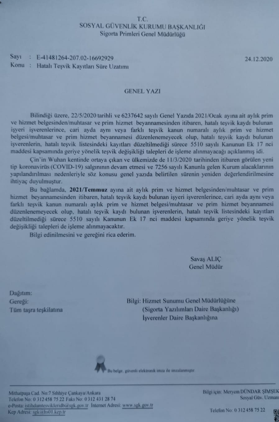 SGK Başkanlığı Sigorta Primleri Genel Müdürlüğü tarafından yayımlanan 24.12.2020 tarihli ve 16692929 sayılı Genel Yazısı ile;