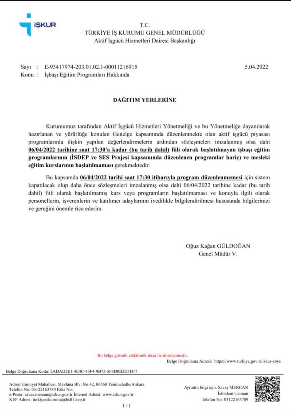Türkiye İş Kurumu Genel Müdürlüğü Aktif İşgücü Hizmetleri Dairesi Başkanlığı tarafından yayımlanan 05.04.2022 tarihli 00011216915 sayılı işbaşı eğitim programları hakkındaki yazıda; 06 Nisan 2022 tarihi 17.30 saati itibariyle program düzenlenmemesi için sistemin kapatılacağı, daha önce sözleşmeleri imzalanmış olsa dahi 06 Nisan 2022 tarihine kadar fiili olarak başlatılmamış kurs veya programların başlatılmayacağı ve tarafların bilgilendirilmeleri gerektiği açıklanmıştır.