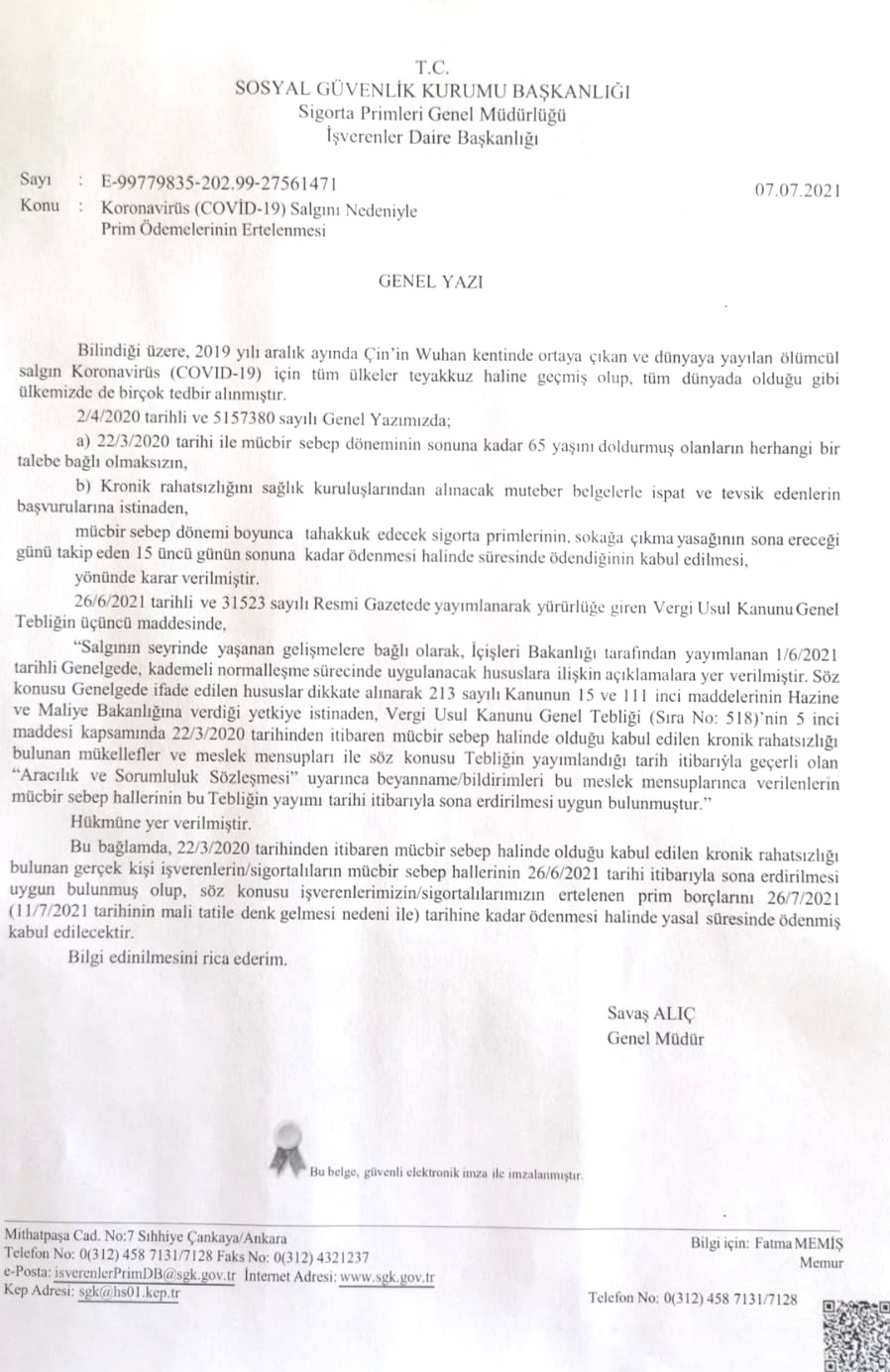 SGK tarafından yayımlanan 07.07.2021 tarihli 27561471 sayılı Genel Yazıda; 22 Mart 2020 tarihinden itibaren mücbir sebep halinde olduğu kabul edilen kronik rahatsızlığı bulunan gerçek kişi işverenlerin/sigortalıların mücbir sebep halleri 26 Haziran 2021 tarihi itibariyle sona erdirildiği belirtilerek ertelenen prim borçları 26 Temmuz 2021 tarihine kadar ödenmesi halinde yasal süresinde ödenmiş kabul edilmiştir.