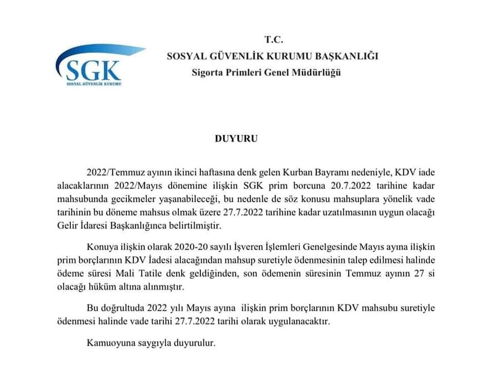 SGK Başkanlığı yayımladığı Duyuru ile, KDV yoluyla prim borcunu ödeyen işverenlerin Mayıs ayı ödemesi 20 Temmuz tarihinden 27 Temmuz tarihine çekildi.