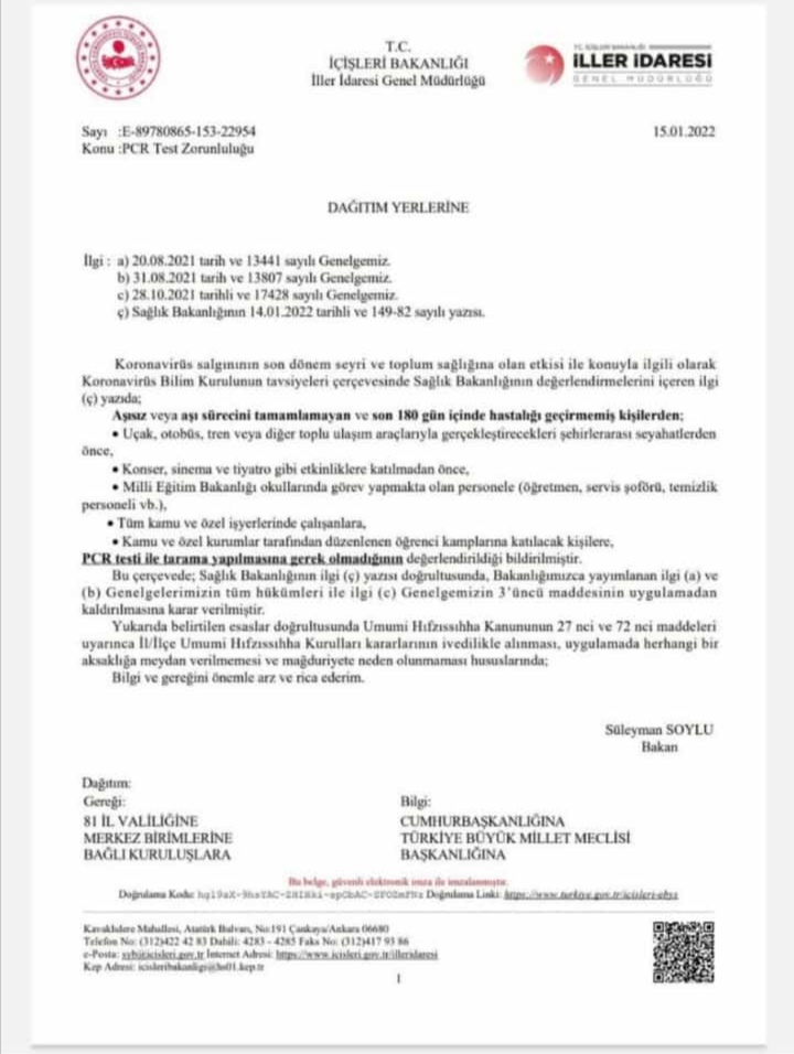 İçişleri Bakanlığı İller İdaresi Genel Müdürlüğü yayımladığı 15 Ocak 2022 tarihli 22954 sayılı yazı ile PCR Testi Taraması zorunluluğunu kaldırıldığını bildirdi.