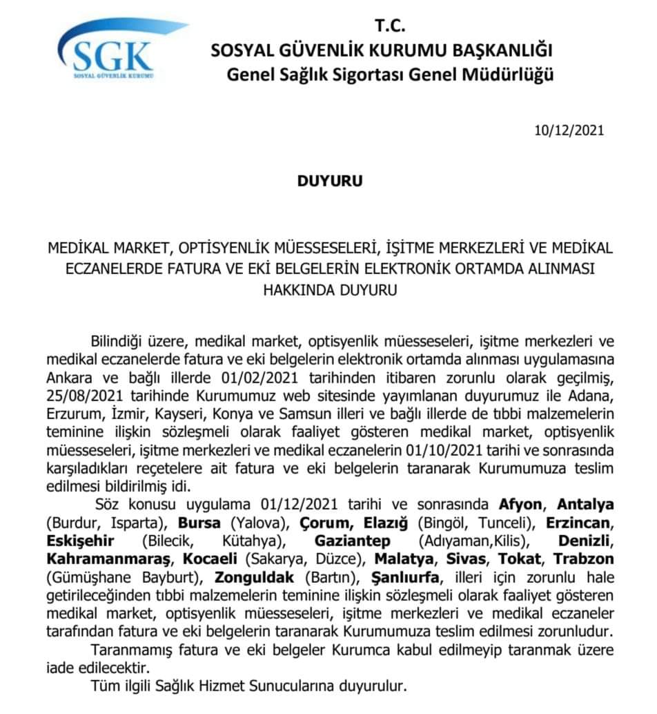 SGK Genel Sağlık Sigortası Genel Müdürlüğü yaptığı 10.12.2021 tarihli duyurusunda,