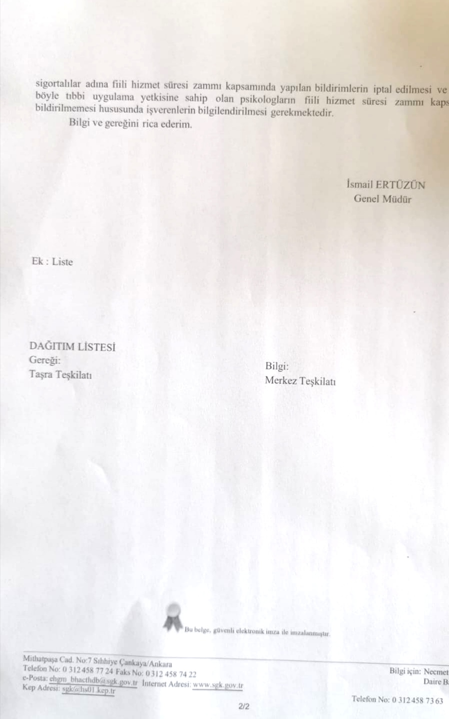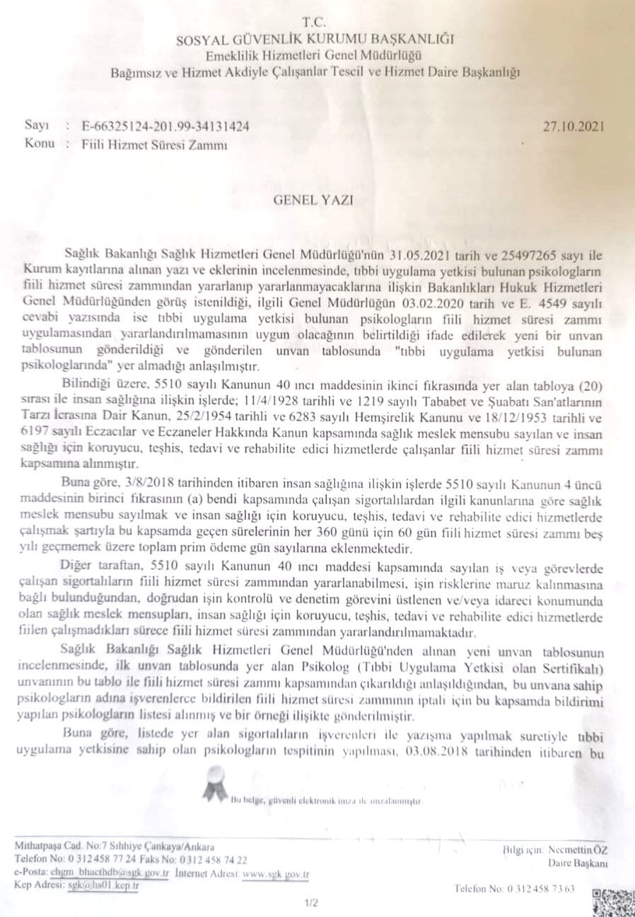 SGK 27.10.2021 tarihli 34131424 sayılı Genel Yazı ile, Sağlık Bakanlığının bildirdiği tabloda tıbbi uygulama yetkisi olan psikologların çıkartılması nedeniyle 03. 08.2018 tarihinden itibaren FHZ kapsamından yararlandırılamayacaktır.
